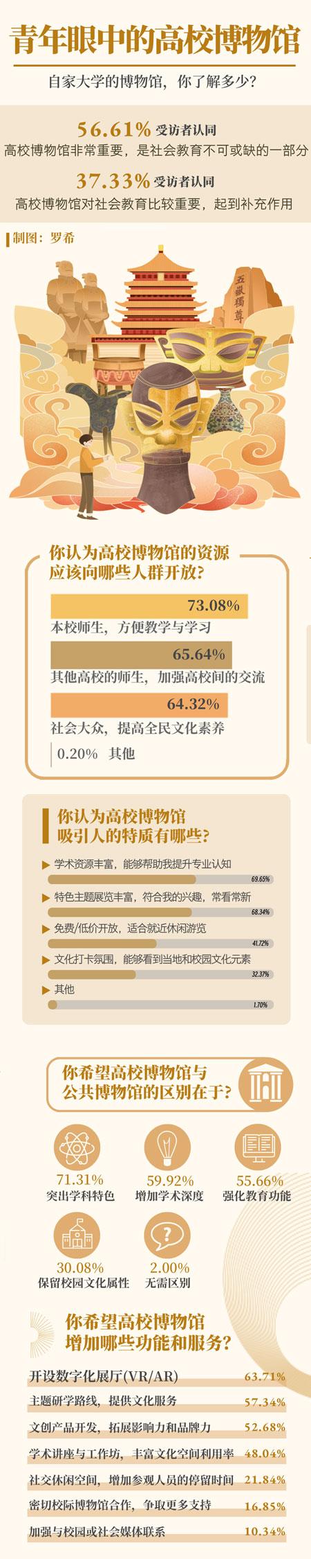 近日,中国青年报·中青校媒就高校博物馆相关话题面向全国高校大学生发起问卷调查,共回收有效问卷6836份。调查结果显示,64.32%受访者认为高校博物馆应该向社会大众开放,56.61%受访者认为高校博物馆在社会教育中扮演不可或缺的角色,37.33%受访者认为高校博物馆在社会教育中起到补充作用。