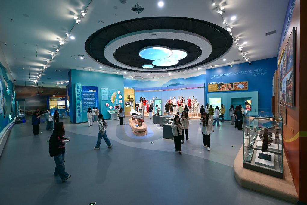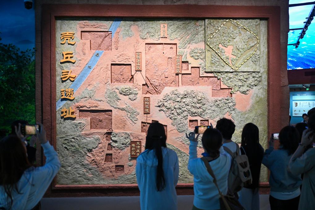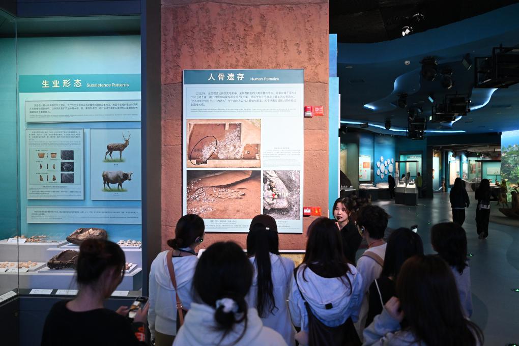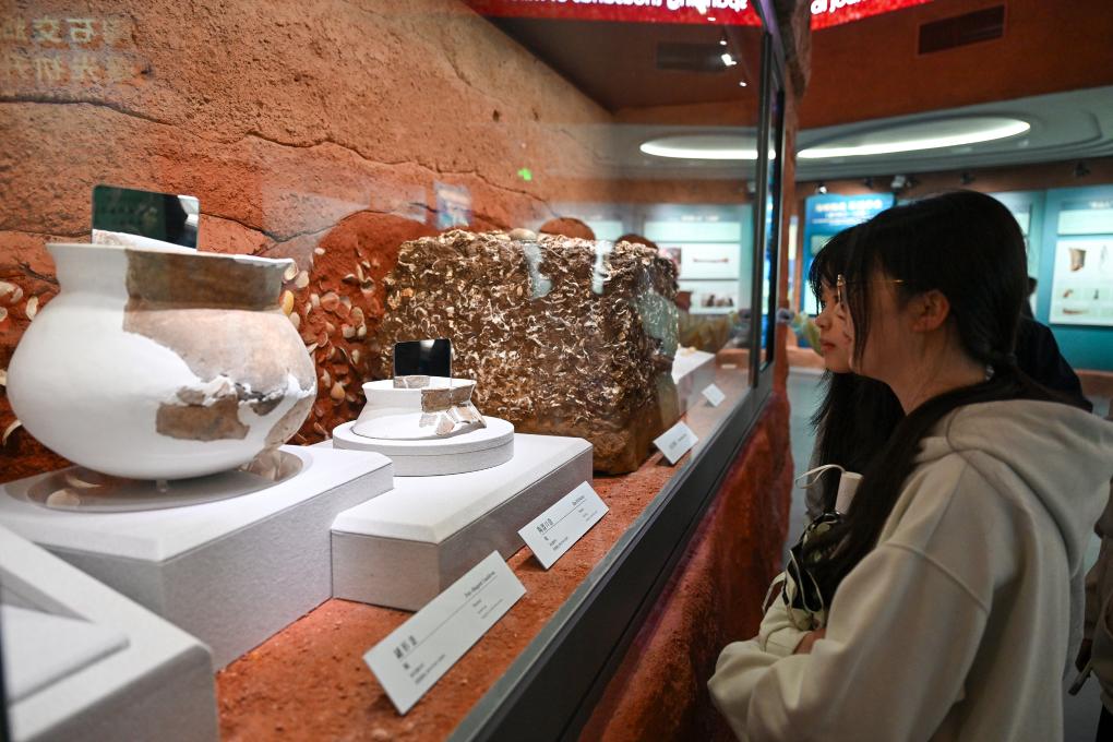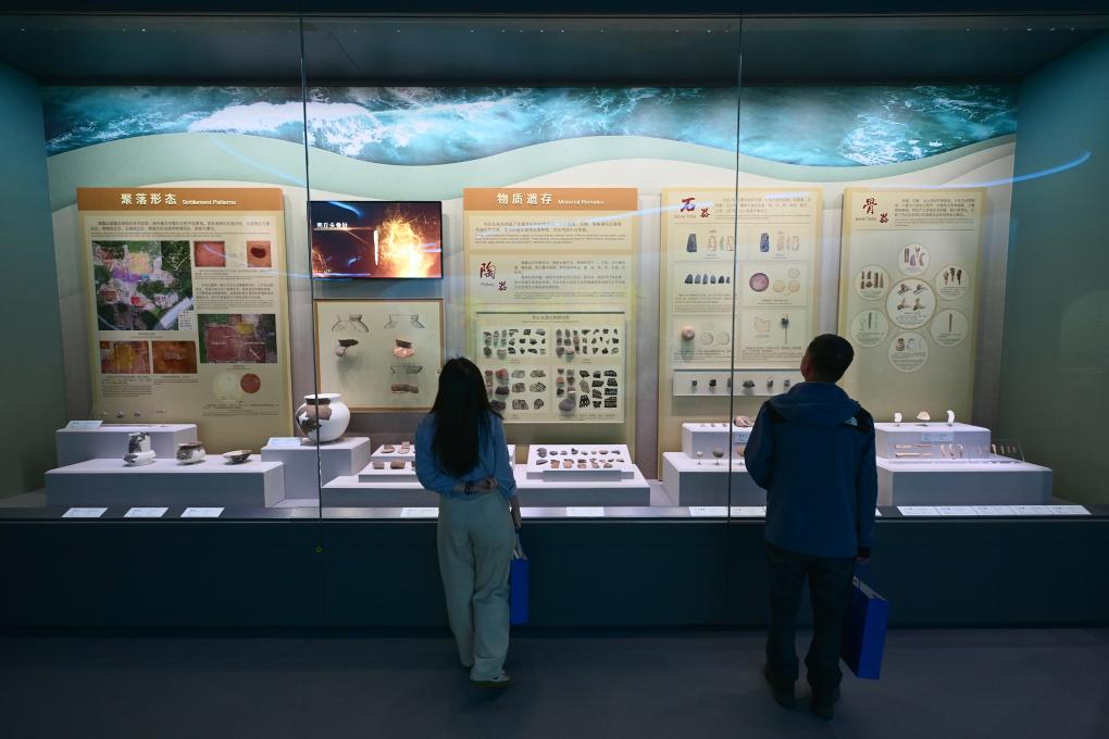 4月9日,观众在中国考古博物馆壳丘头分馆内参观。