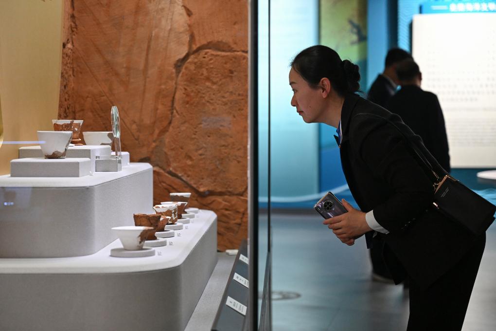 4月9日,观众在中国考古博物馆壳丘头分馆内透过放大镜看陶杯上的纹饰。