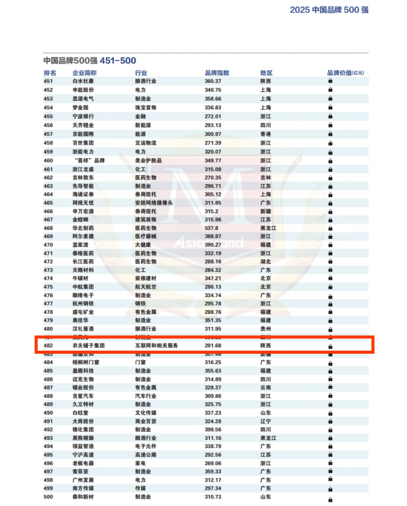 2025年5月24日,以“品牌资产数字化与价值共创”为主题的第11届品牌强国论坛暨2025中国品牌500强发布会在深圳盛大举行。本届论坛由专业品牌评价机构Asiabrand发起主办,中国亚洲经济发展协会、香港“一带一路”总商会联合主办,汇聚了众多行业精英、专家学者及知名企业代表,共同探讨品牌发展的新趋势与新路径。在此次备受瞩目的品牌盛会上,农夫铺子发展集团有限公司以291.68的品牌指数,105.15亿元的品牌估值荣登中国品牌500强榜单,成为互联网和相关服务行业数字化转型的领军力量。