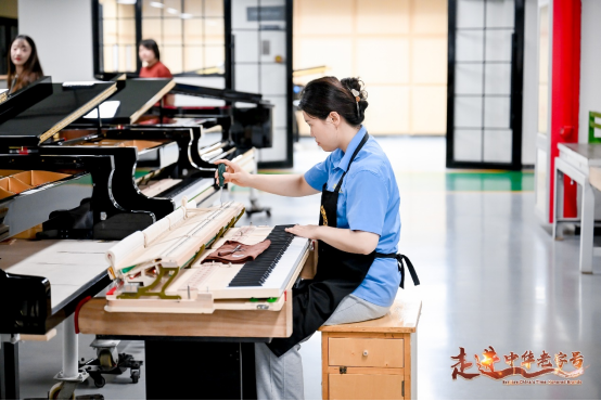 嘉宾们深入星海历史与技术展厅,近距离感受76年的匠心传承。从1949年新中国第一架钢琴的诞生,到见证重大历史时刻的15尺钢琴,再到享誉世界的精湛工艺,星海的历史画卷徐徐展开。新中国第一架钢琴复原模型、北京奥运会开幕式郎朗演奏的钢琴展品,无声诉说着星海对匠心的永恒守护与文化根脉的深情。步入大师工坊,嘉宾们实地观摩了钢琴生产线,见证了88道精密工序的严谨:数控音板加工中心的毫米级精度、技师手工调音的“金耳朵”绝活,无不彰显着工业化标准与工匠精神的完美融合。来自美国的声学物理学家James Abbott即兴在大师钢琴上弹奏一曲,悠扬婉转的旋律令全场沉醉。