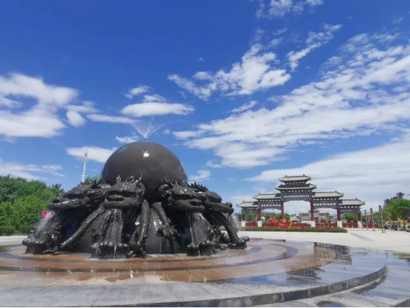 九渠广场是青铜峡黄河大峡谷旅游区入口的标志性建筑,由九龙戏珠和九龙图腾柱组成。我国古代把数字分为阳数和阴数,奇数为阳,偶数为阴,而阳数中九为最高。九龙戏珠为铜质雕塑,寓意青铜峡有着九大干渠,将九大干渠比喻为九龙,把青铜峡水利枢纽比喻明珠,代表了回汉等各族人民团结进取,引黄河水发展农业振兴经济,成就了宁夏塞上江南的美景。九龙图腾柱为汉白玉雕刻石柱,雕刻着人类的文明和发展,整体气势磅礴,所刻内容迥然不同,它不仅仅是一个雕塑作品,更是青铜峡风貌的缩影。