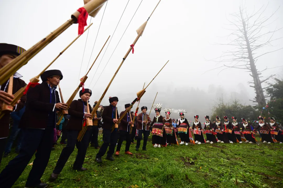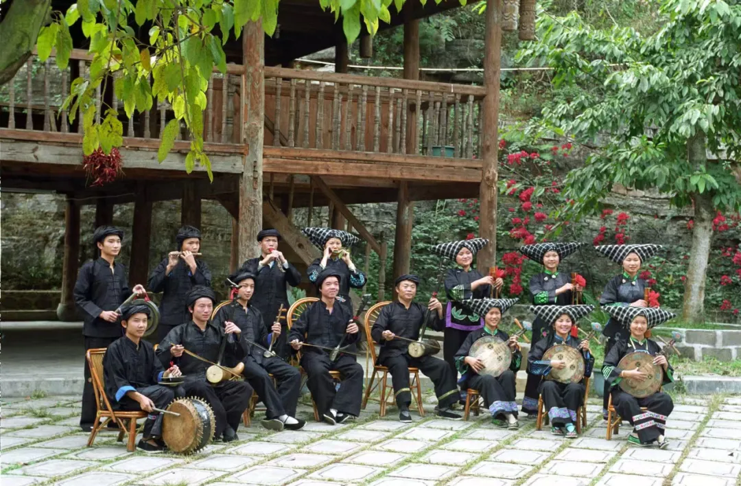 黔西南州布依族八音坐唱被誉为“声音活化石”与“天籁之音”,其起源可追溯至唐宋宫廷雅乐,元明时期融入布依族农耕文化与民俗元素,形成以丝竹乐器为主的独特说唱形式。表演以牛骨胡、葫芦琴、月琴等八种传统乐器围圈轮奏,伴以布依语演唱,内容涵盖神话传说、爱情故事与农事节庆。从田间地头到高校讲堂,从村寨戏台到国际银幕,八音坐唱始终以灵动的旋律,诉说着布依族千年不变的生命韵律。布依族八音坐唱2006年入选首批国家级非物质文化遗产名录。