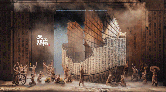 该剧以“大、巧、简”的美学特征著称,被誉为“文艺界的大作,舞剧界的大片”。舞台设计并未简单复刻历史场景,在结合了大量史料考据的基础上,巧妙融合了明代画卷、器物、服饰、建筑等元素,以极具当代性的视觉语汇,对这部百科全书式著作中蕴含的古代工艺智慧、造物哲学进行了创造性的艺术转译,将《天工开物》的科技美学转化为震撼的舞台视觉,将古代工匠的巧思与现代工业美学融为一体。
