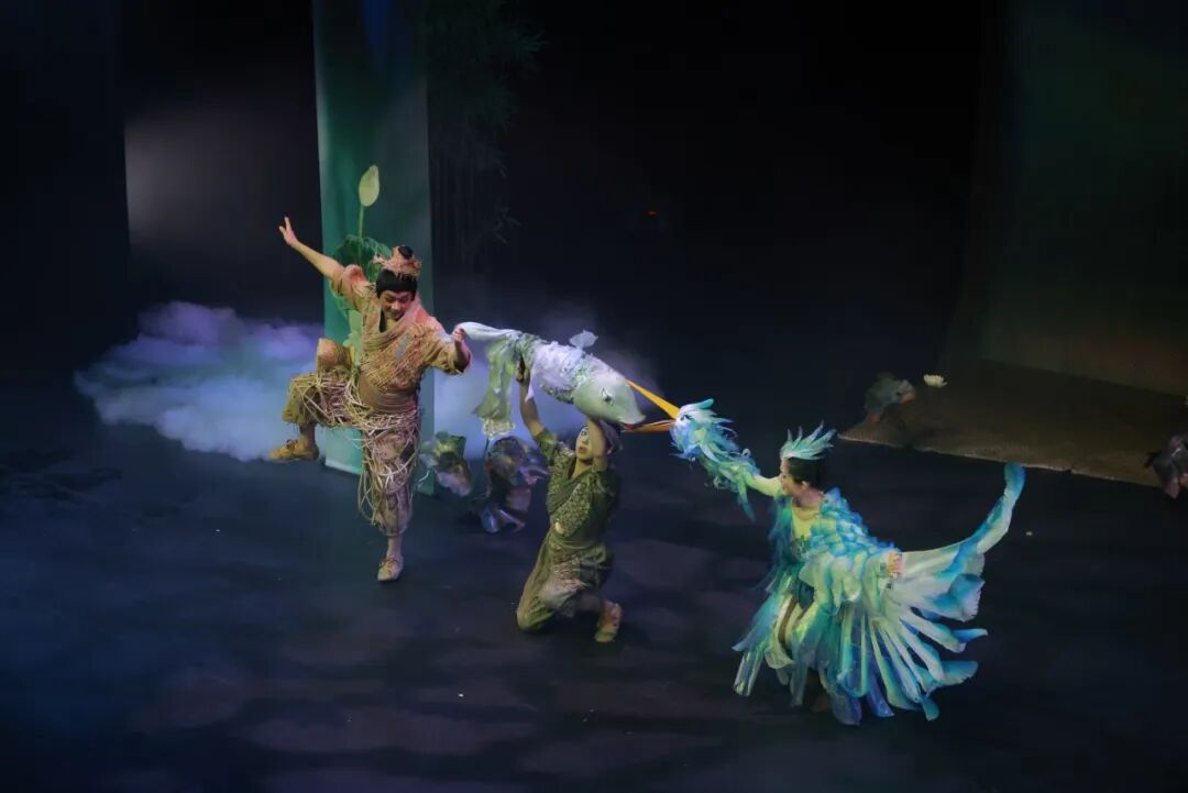 演出现场座无虚席,气氛热烈。《鹬·蚌·鱼》围绕“和”的理念展开,帮助孩子理解和谐相处的美好。“鹬”狡黠、“蚌”憨厚、“鱼”灵动,演员们用精湛肢体语言,将三者从相争到相融的故事演绎得生动鲜活。虽无语言表述,但细腻动作、明快音乐与充满想象力的舞台呈现完美融合,成功打破文化与语言壁垒,全剧借“争”与“不争”的不同结局,寓教于乐,将中国“和谐共处、美美与共”的传统智慧融入儿童情感世界。