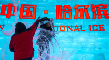 1月3日,在哈尔滨冰雪大世界进行的第37届中国·哈尔滨国际冰雕比赛进入第二天赛程,来自12个国家的76位选手在严寒中精雕细琢,参赛作品已芳容初现。