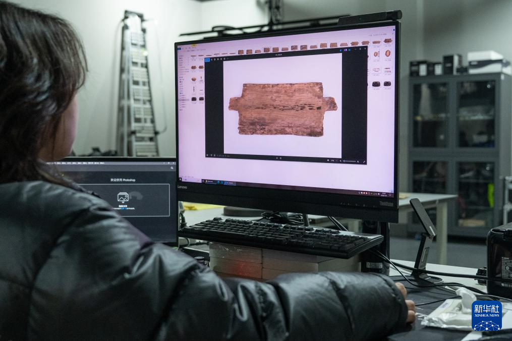 1月9日,在湖北荆州文物保护中心,工作人员查看文物照片。