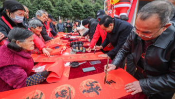 这是2月1日在莲花镇年俗文化活动现场拍摄的写春联送福字活动。