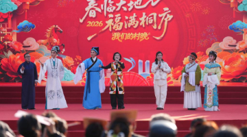 2月3日,演员们在江苏省泰州市海陵区城东街道唐甸村村头进行民俗表演(无人机照片)。