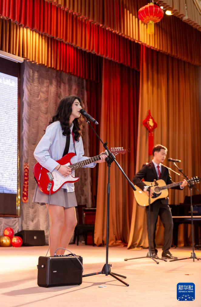 2月4日,在阿塞拜疆首都巴库举行的“骏马迎春 中阿同心”春节庆祝活动上,一名阿塞拜疆学生演唱中国歌曲。