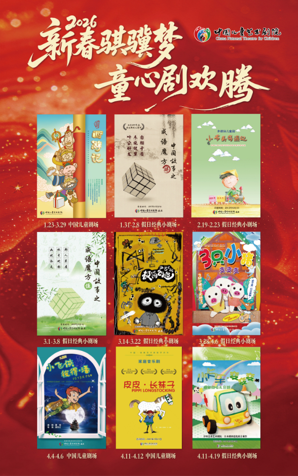 2026年“两节”期间,中国儿童艺术剧院以“新春骐骥梦,童心‘剧’欢腾”为主题,推出新春演出季,以11部优秀儿童剧目、61场精彩演出,为少年儿童及家庭呈上新春文化艺术盛宴。