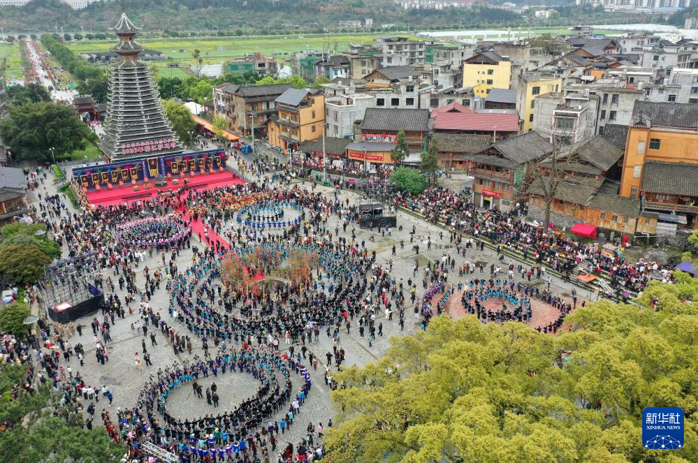 3月28日,在贵州省榕江县三宝侗寨,侗族群众跳千人多耶舞欢庆“萨玛节”(无人机照片)。