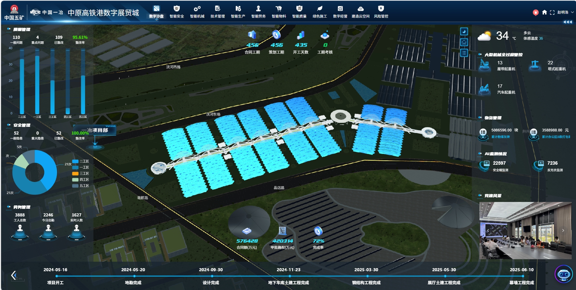 总承包方中国一冶深入转变项目管理思路,围绕中原高铁港数字展贸城项目工期时间短,建筑体量大、立体交叉作业复杂等特点,通过数字化建造提升项目履约效率。自主研发“一冶云建”数字建造平台,打造数字建造3.0版,覆盖“设计-施工-运维”全生命周期,实现对项目管理全要素覆盖和数字化调度。