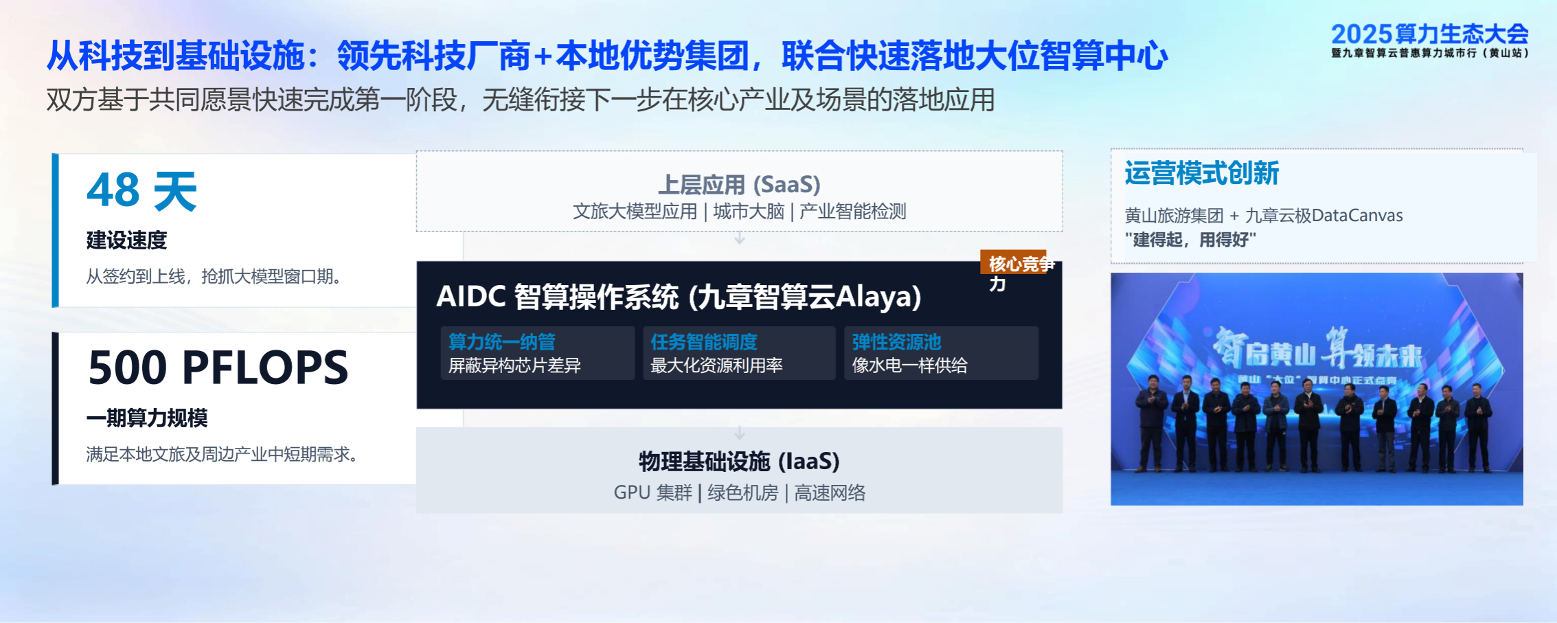 在基建阶段,九章云极与黄山旅游集团联手创下“48天上线”行业纪录,凭借成熟技术方案快速落地500 PFLOPS算力规模。“科技厂商+本地集团”的创新合作模式,有助于实现算力统一纳管与弹性调度,确保智算基础设施“边建边用”,为黄山智能经济发展筑牢坚实算力底座。
