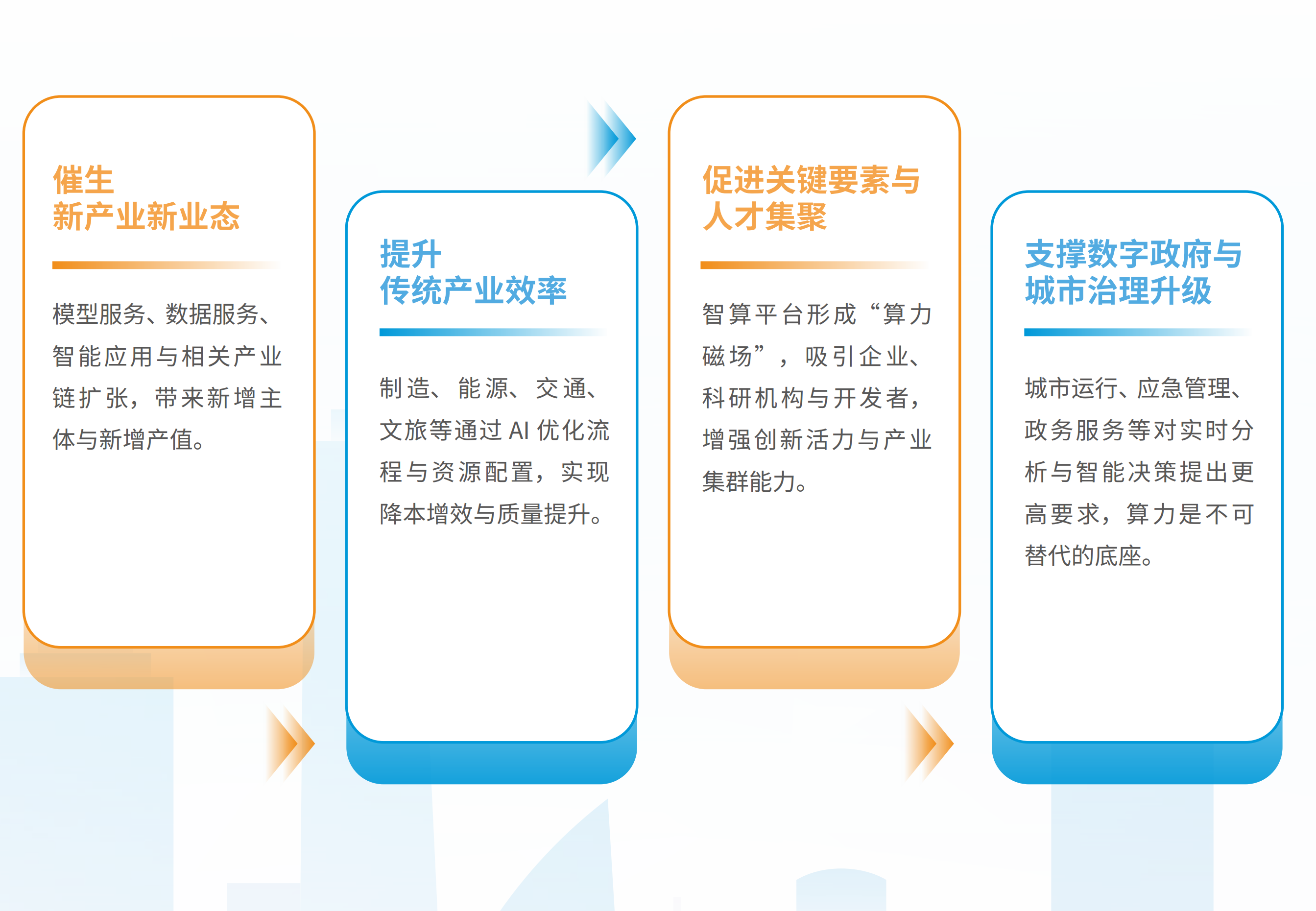 随着智能算力的适度超前建设,智算经济中“算法 + 数据 + 算力” 的生产要素组合得以最大限度发挥能效,推动经济发展范式从“资本 + 劳动力”转向“算法 + 数据”,对城市经济和产业发展带来四大方面的利好。