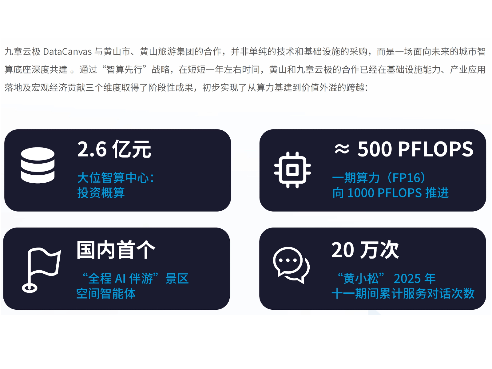 九章云极与黄山市政府开展深度战略合作,双方以“算力筑基、产业赋能、城市智治”为方向,创下48天完成智算中心落地的“黄山速度”,并构建起"科技厂商+地方政府"的联合运营创新模式。