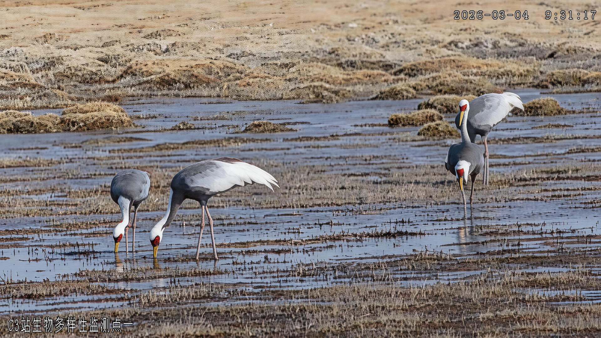 3月4日上午,内蒙古鄂尔多斯市乌审旗,中国石油长庆油田苏里格南作业分公司苏南-C3区自主贡献型生物多样性保护地(OECM)的浅水湿地旁,5只“稀客”翩然而至——国家一级重点保护野生动物白枕鹤正在悠闲觅食。生物多样性综合监测系统实时捕捉到了这一珍贵画面。这是中国石油自主贡献型生物多样性保护地首次记录到该物种。