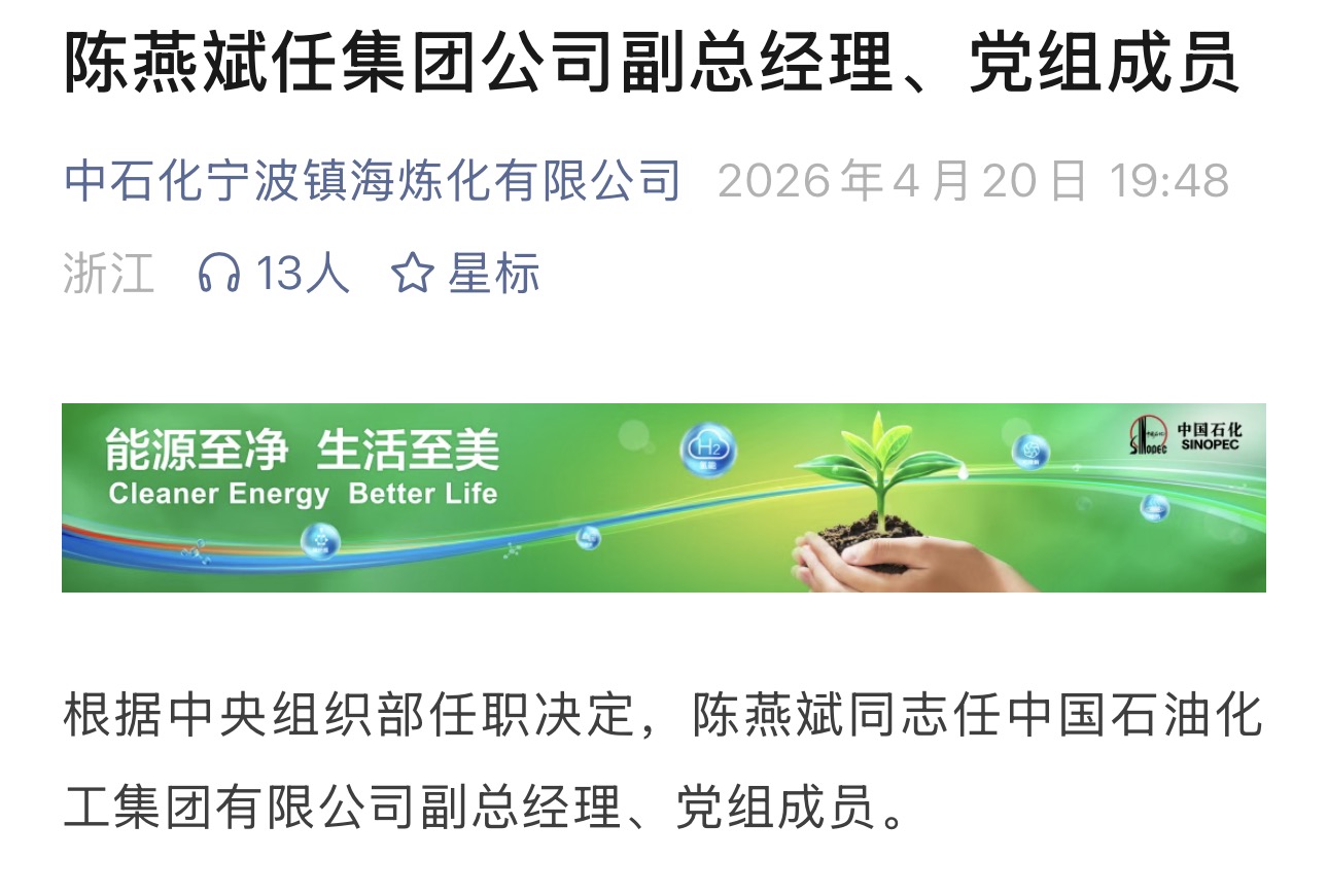 据中国石化消息,根据中央组织部任职决定,陈燕斌同志任中国石油化工集团有限公司副总经理、党组成员。