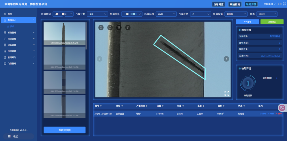 该技术在纯阳山风电场巡检中同样发挥了重要作用。巡检发现,叶片出现前缘砂眼、保护层破损、纤维层破损、鼓包等缺陷,共计284处。检修团队可根据平台智能算法识别的缺陷大小、位置等信息判断缺陷等级,合理安排检修计划。