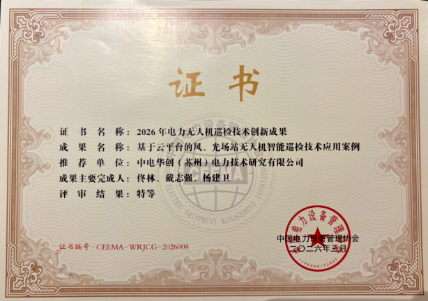 近日,2026年电力无人机技术交流研讨会上传来捷报,中电华创“基于云平台的风、光场站无人机智能巡检技术应用案例”获评电力无人机巡检技术创新成果特等奖。
