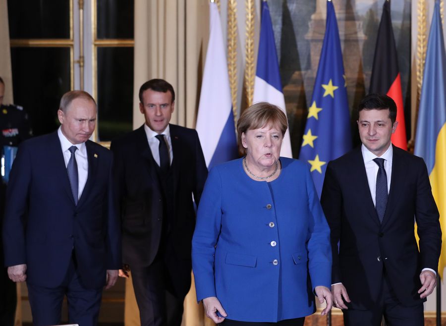 Russian President Vladimir Putin, French President Emmanuel Macron, German Chancellor Angela Merkel and Ukrainian President Volodymyr Zelensky (L to R) attend "Normandy four summit" in Paris, France, Dec. 9, 2019. (Xinhua/Gao Jing)