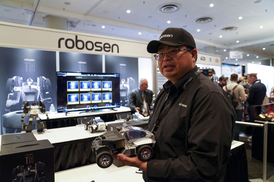 Jacob Cheng, general manager of the U.S. subsidiary of Robosen Robotics (Shenzhen) Co., introduces T9 miniature robots at the 2020 Toy Fair New York held in New York, the United States, Feb. 25, 2020. Robosen Robotics (Shenzhen) Co., a Chinese tech startup, made its debut at the annual Toy Fair in New York City, aiming to bring innovative gadgets to overseas consumers. (Xinhua/Wang Ying)