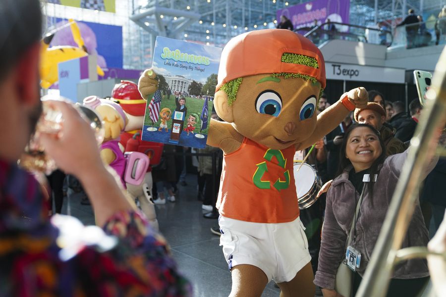 A visitor takes a selfie with a costumed performer at the 2020 Toy Fair New York held in New York, the United States, Feb. 22, 2020. The 2020 Toy Fair New York kicked off on Saturday at the Jacob K. Javits Center in Manhattan, attracting more than 1,000 exhibitors from around the world to showcase some 150,000 toys, games and youth entertainment products. (Xinhua/Wang Ying)