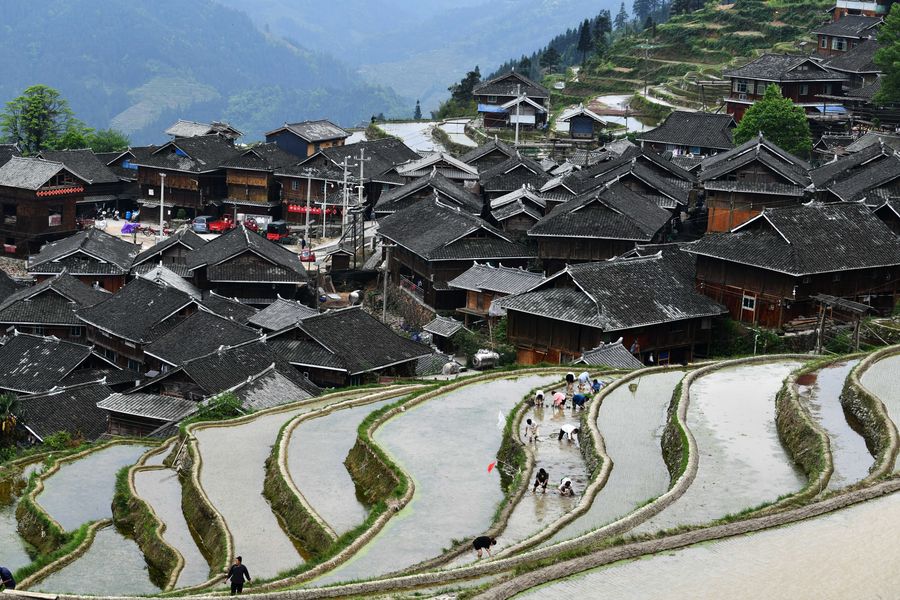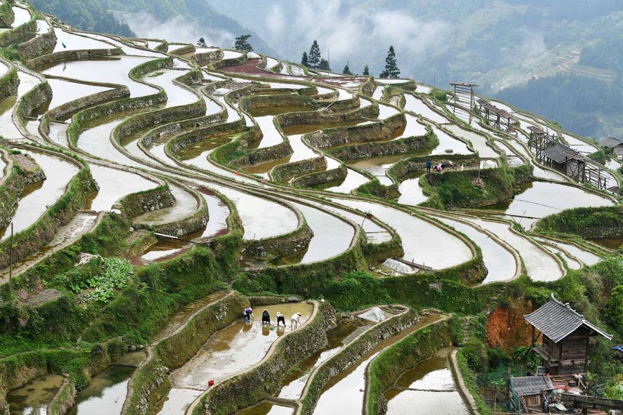 Farmers plant rice seedlings in terraced fields at Jiache Village of Jiabang Township in Congjiang County, southwest China's Guizhou Province, April 18, 2020. (Xinhua/Yang Wenbin)