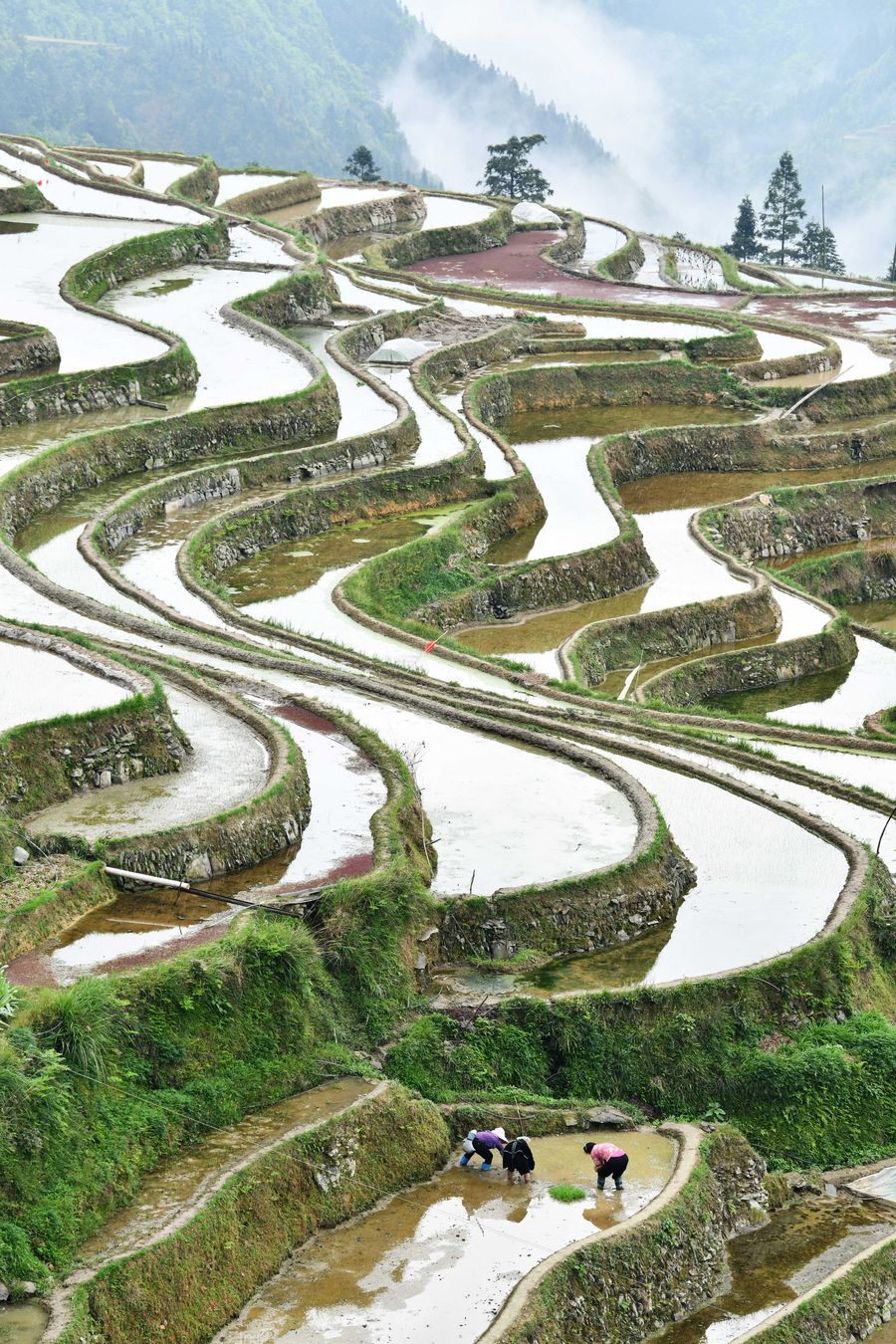 Farmers plant rice seedlings in a terraced field at Jiache Village of Jiabang Township in Congjiang County, southwest China's Guizhou Province, April 18, 2020. (Xinhua/Yang Wenbin)