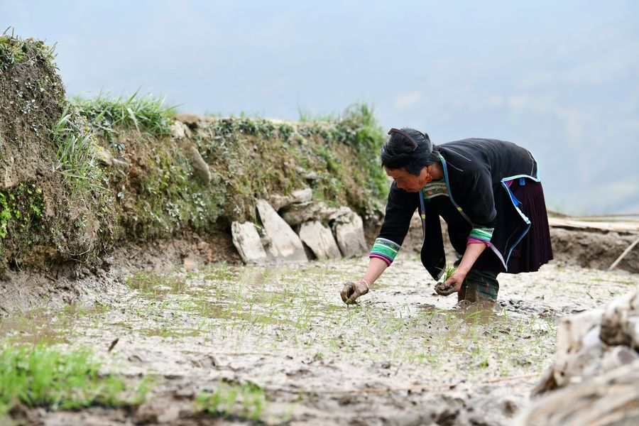 A farmer plants rice seedlings in a terraced field at Jiache Village of Jiabang Township in Congjiang County, southwest China's Guizhou Province, April 18, 2020. (Xinhua/Yang Wenbin)