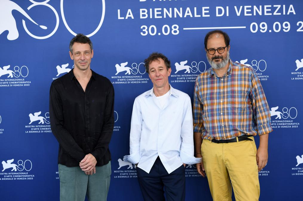 9月3日,电影《野兽》导演贝特朗·波尼洛(中)携主创人员出席意大利威尼斯电影节拍照式。新华社记者 金马梦妮 摄