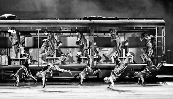 大幕拉开,极度困苦的百姓在铁道上冒死争抢日军物资,枪声响起,鲜血四溅。日寇的铁蹄无情践踏,乡亲们扭曲的躯体凝成无声却痛苦的呐喊。人群中,抗争的身影开始屹立,李正、刘洪、王强等为首的铁道游击队依靠群众的深厚根基,以微山湖为根据地,在列车飞驰的铁道上与侵略者展开生死较量。紧张的音乐节奏、精细的舞台调度交织出强烈的悬念和动感,在“夜袭洋行”一段,可旋转的箱盒般日式建筑立在舞台中心,舞者绕行周围,配合光影的精细变幻,呈现出宛若环拍镜头的视觉效果;“智打票车”舞段中,车厢实景不动,快速流过的多媒体影像却让列车“风驰电掣”。