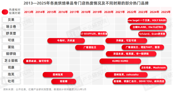 “小而精”的单品专门店持续涌现,“大而全”的“烘焙工厂”在下沉市场迅速崛起。据红餐产业研究院不完全统计,2013年至2025年5月,烘焙单品专门店呈现“接力式走红”态势,从早期的芝士蛋糕、泡芙、吐司、可颂,到后续兴起的蛋挞、舒芙蕾、铜锣烧,再到近三年热度迅猛上升的贝果、瑞士卷与司康,越来越多的细分产品被挖掘。与此同时,一批主打“大而全+高性价比”的“烘焙工厂”品牌在下沉市场迅速崛起。