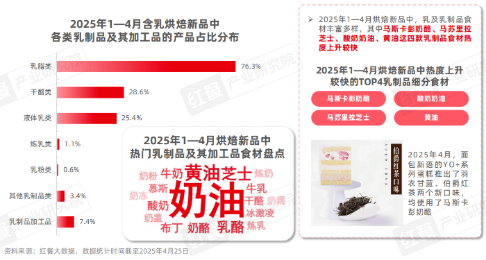 在乳制品食材方面,在2025年1—4月烘焙样本品牌的新品中,使用乳脂类乳制品的新品最多,占含乳烘焙新品总数的76.3%,其次是干酪类和液体乳类,占比分别达到28.6%和25.4%。