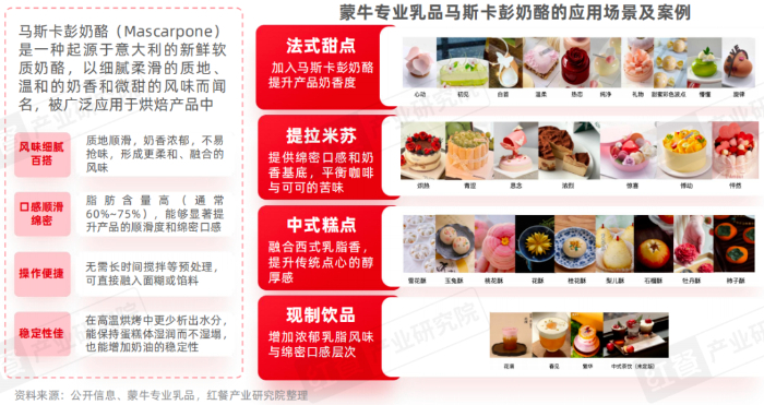 以蒙牛专业乳品新推出的马斯卡彭奶酪为例,其通过自主研发实现马斯卡彭奶酪的国产化,并积极拓展其多元应用方向。在2025年第27届中国国际烘焙展上,蒙牛专业乳品展示了多款含马斯卡彭奶酪的烘焙新品,涵盖法式甜品、提拉米苏蛋糕、中式糕点、现制饮品四大应用场景,这些新品通过融入马斯卡彭奶酪进一步丰富了产品的奶香层次与顺滑口感。