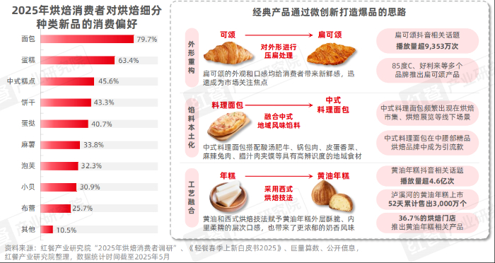 经典产品仍在引领消费主流,扁可颂、黄油年糕等微创新新品快速出圈。据红餐产业研究院调查数据,面包(79.7%)和蛋糕(63.4%)仍是当前消费者最常购买的烘焙产品类型,中式糕点(45.6%)、饼干(43.3%)、蛋挞(40.7%)等传统经典产品也依然保持较高热度。