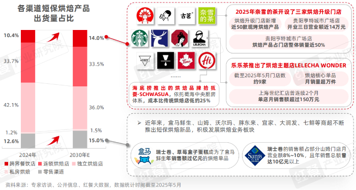 随着近年“烘焙+”“+烘焙”模式加速渗透,不少茶饮、咖饮、火锅品牌跨界布局烘焙赛道。同时,商超、电商等渠道越来越受到消费者青睐。预计到2030年,烘焙专门店的出货量占比会降至71.0%,同时跨界餐饮店和零售渠道的占比会提升至14.0%和15.0%。