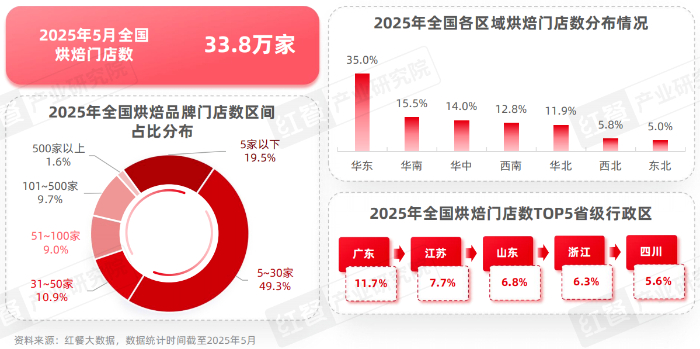 但总体来看,烘焙品类的规模化程度仍有较大的提升空间。据红餐大数据,截至2025年5月,门店数在5—30家的烘焙品牌占比达到49.3%;而门店数在5家以下、31—50家的烘焙品牌占比分别达到19.5%和10.9%。