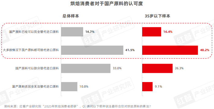 国产原料在烘焙领域的接受度提升,本土优质烘焙原料持续受到关注。据红餐产业研究院的调研数据,在整体样本中,56.2%的消费者认为国产原料“在大多数情况下可以替代”或“已可完全替代”进口原料。其中,35岁以下年轻消费者的认可度相对更高,64.6%持有相同观点。
