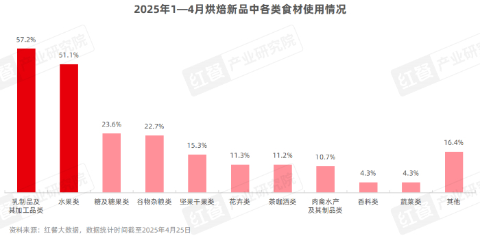 从食材应用来看,据红餐大数据,2025年1—4月烘焙样本品牌的新品中,使用乳及乳制品类、水果类食材的新品数量相对较高,占比分别达到57.2%和51.1%。与此同时,为了满足消费者对于健康饮食的需求,糖及糖果类食材在新品中的使用频次较去年同期有所下降,而谷物杂粮类、坚果干果类食材的应用频率则有所提升。