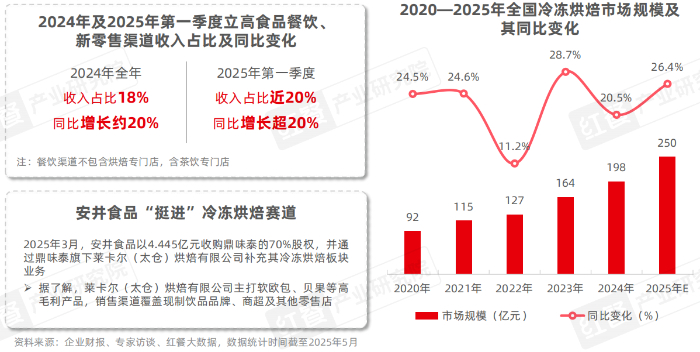 与此同时,烘焙品类市场规模的持续扩大,促使中上游供应链加速升级迭代,冷冻烘焙、本土原料均得到市场青睐。据红餐产业研究院,全国冷冻烘焙市场保持较快增速,预计2025年市场规模将达到250亿元。