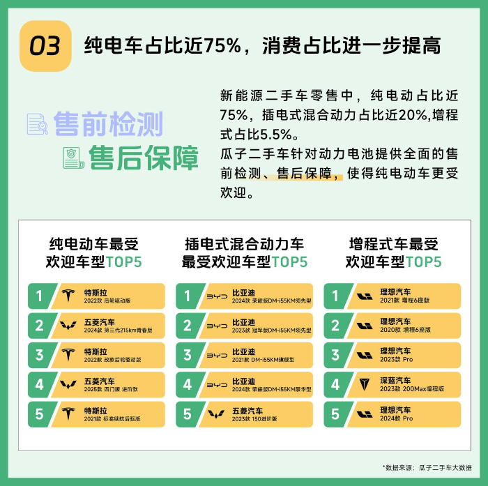 纯电平台具有更易集成电驱与智能系统等优势,加上瓜子二手车针对动力电池提供全面的售前检测、售后保障,使得纯电动车更受欢迎。瓜子二手车交易大数据显示,纯电动车中,最受欢迎的五款车型均来自特斯拉、五菱汽车两大品牌。插电式混合动力车中,最受欢迎的五款车型有四款为比亚迪车;增程式车中,最受欢迎的五款车型有四款来自理想汽车,鸿蒙智行有两款车型进入前十。