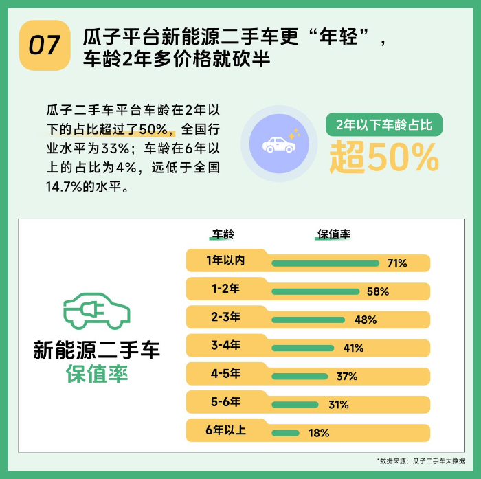 随着车龄增加,新能源二手车交易价格也大幅降低。瓜子二手车平台交易数据显示,车龄在3—4年的交易均价是新车指导价的41%,车龄在4—5年的交易均价已降至新车指导价的37%,车龄在5—6年的交易均价只是新车指导价的31%。