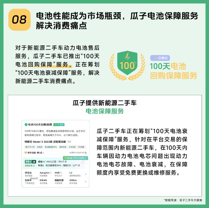对于在瓜子平台交易的新能源二手车,瓜子二手车已推出“100天电池回购保障”服务,即针对该保障覆盖的车源,若在正常使用条件下,在100天/5000公里内(以先到者为准),出现电池衰减超过10%的情况,平台无条件对车辆原价回购。
