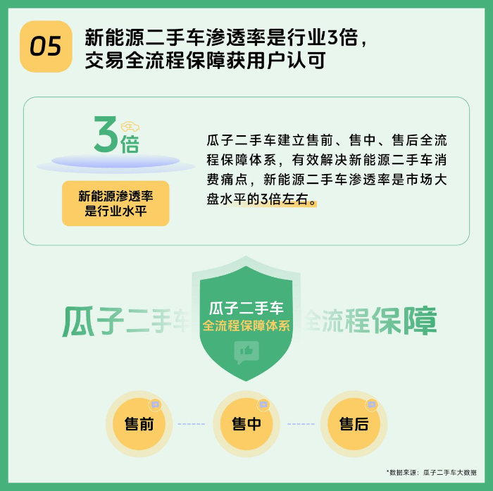 瓜子二手车交易数据显示,平台的新能源二手车渗透率是市场大盘水平的约3倍。为促进二手车尤其是新能源二手车交易,解决新能源二手车交易存在的交易价格不稳定、电池质保等突出障碍,瓜子二手车通过引入电商模式打造二手车交易“线上超市”,建立售前、售中、售后全流程保障体系,有效解决新能源二手车消费痛点,积极推动二手车尤其是新能源二手车流通,促进二手车市场发展。