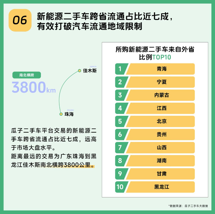 瓜子二手车平台交易数据显示,2025年上半年,新能源二手车跨省流通占比近七成。