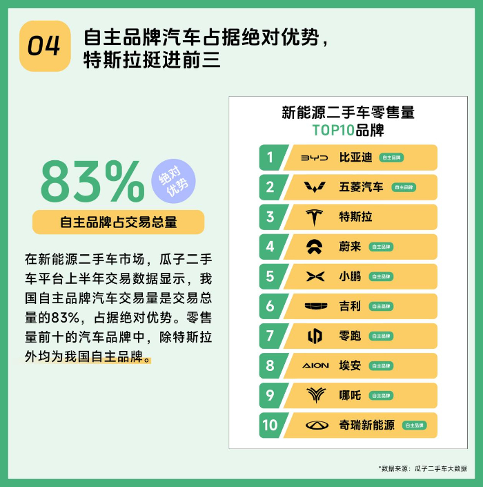 在新能源二手车市场,瓜子二手车平台上半年交易数据显示,我国自主品牌汽车交易量是交易总量的83%,占据绝对优势,其中比亚迪占比最大;美系车占交易总量的11%排第二,其中85%为特斯拉;第三为德系车,占比4%。