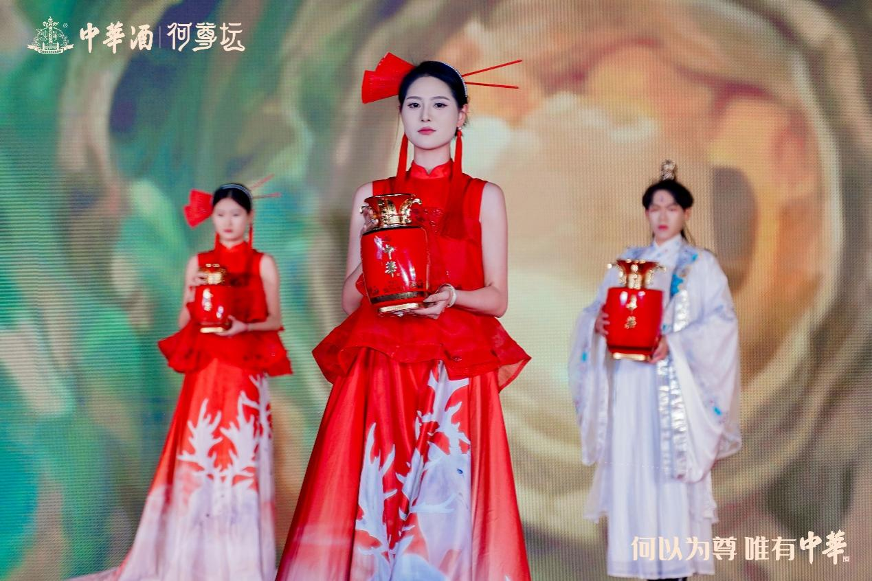 现场同步上演乐舞《琴醉山河》,青铜纹饰投影随乐声流转于穹顶;《周风秦韵》国服大秀中,模特手持中华酒(何尊坛)登场,古老纹样与现代设计碰撞出惊艳火花。