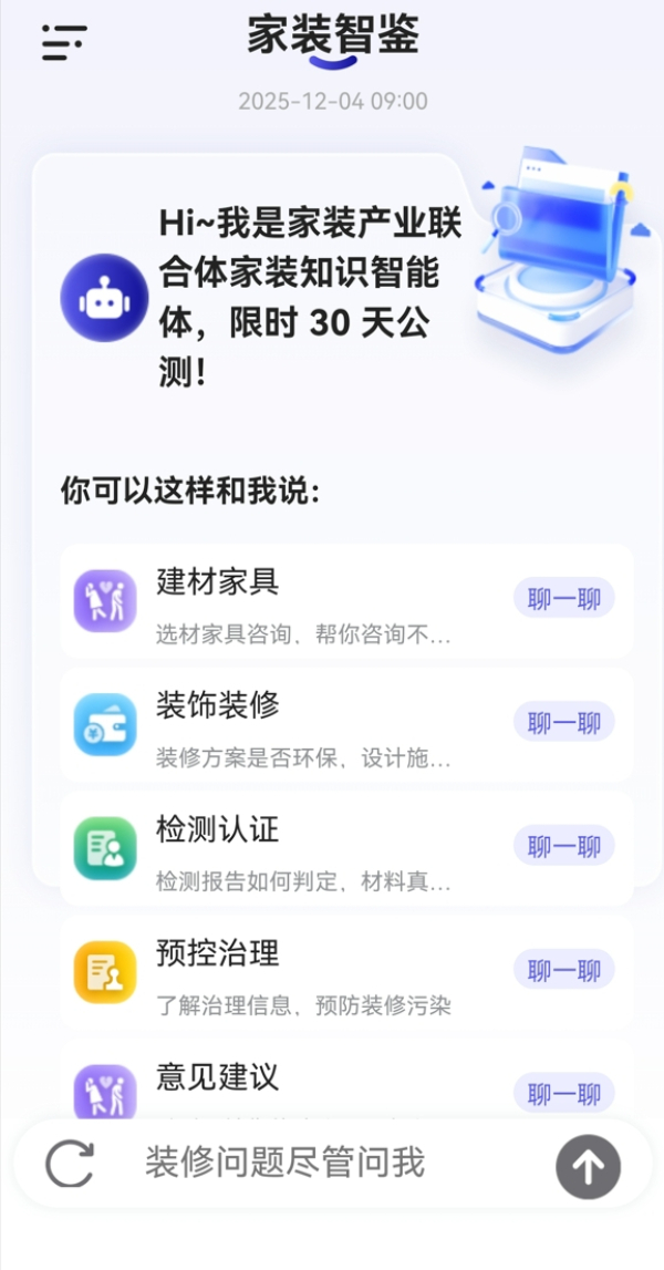 “智能体”将通过“联合体”成员单位市场监管总局认研中心、中国室内装饰协会、中国建筑装饰协会住宅装饰装修和部品产业分会、全联环境服务业商会室内车内环境管理专业委员会、北京五洲恒通认证有限公司、南京市产品质量监督检验院、上海聚通装饰集团有限公司的官方微信公众号,进行为期一个月的公开测试。该“智能体”作为技术引擎,通过智能问答、知识库等,为家装产业注入动态、精准的智能化能力,为消费者和产业从业者提供权威、透明的家装知识服务。