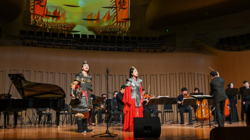 当晚的演出,上半场是周宏桥创作的五幕诗剧《霸王别姬·生死恋》改编而成的歌剧的一个浓缩版,由2025年古根汉姆大奖获得者王心阳执笔作曲,王心阳也是中国音乐界仅有的两位古根汉姆大奖获得者之一。故事描写了楚汉两军在垓下决战,汉军设下十面埋伏,楚军陷入四面楚歌。在生死绝境,西楚霸王项羽与其挚爱虞姬共同演绎出一段千古悲剧:“四面楚歌起,江东犹可期;待王卷土日,重与妾魂依。” (《两千年后代虞姬重和项羽“垓下歌”》)虞姬垓下自刎,一代美人为爱与忠诚奉献生命;项羽乌江不渡、自杀殉节,成为抗争命运不公的悲剧英雄。项羽的扮演者为曾获瑞士国际声乐大赛一等奖得主陈炯然,虞姬的扮演者为刚获今年美国古典音乐家大赛一等奖的谭诚。